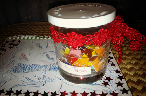 A minha é um copo, na verdade. Podemos decorá-las como quisermos, escrever os títulos em papelinhos coloridos, colar borboletas no vidro. O objectivo é tirar os papelinhos ao acaso e ler o título indicado, o que providencia uma forma entusiasmante de escolher em que livro pegar a seguir. Para quem tiver dificuldade em colocar as próximas leituras numa escada de prioridades, pode sempre usar este método para tirar à sorte.
